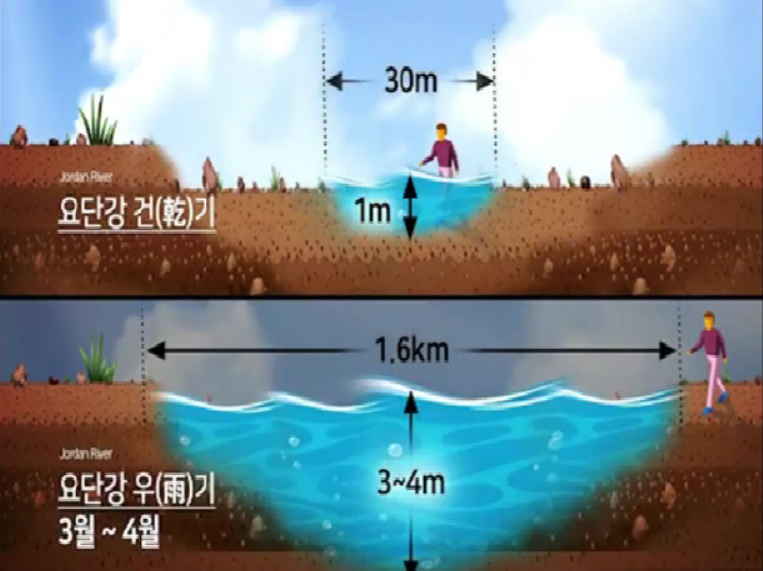 바로 요단강의 수위 때문이었습니다. 이스라엘은 우기와 건기가 아주 뚜렷합니다.